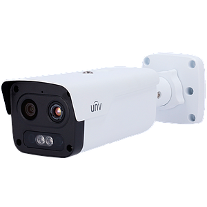CAMARA TERMICA DUAL IP UNIVIEW 4MPX FUNCIONES INTELIGENTES SIP DETECCION DE FUMADORES DETECCION DE FUEGO MICROFONO ALARMA RANURA MicroSD AUDIO IR 30 metros ONVIF POE EXTERIOR IP67