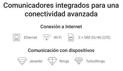 Su comunicación se basa en los protocolos propietarios Jeweller, Wings y TurboWings que garantizan transmisión bidireccional, cifrada y estable a una distancia de hasta 1.800 metros.