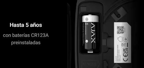 El dispositivo ofrece hasta 5 años de autonomía mediante baterías CR123A preinstaladas y sustituibles sin herramientas, y permite el control y configuración remota desde la app Ajax.
