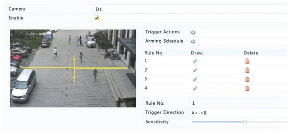 CRUCE de LÍNEA y PERÍMETRO: La detección de cruce de línea genera eventos por el traspaso de una o dos líneas de cruce virtuales de cualquier persona, animal o vehículo que traspase dicha línea, sea en un solo sentido o de forma bidireccional. Cuando la línea virtual se cruce se genera un salto de alarma vinculado a diferentes acciones.