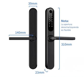 Esta cerradura inteligente permite desbloqueo mediante huella dactilar, código PIN, tarjeta RFID, aplicación móvil vía Wi-Fi/Bluetooth y llave física de emergencia, asegurando versatilidad en su uso.