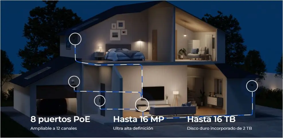 Entrada de vídeo IP Máximo 16 cámaras cableadas (PoE y Wi-Fi con enchufe) y 8 cámaras Wi-Fi con batería. Hasta 16 MP por canal.