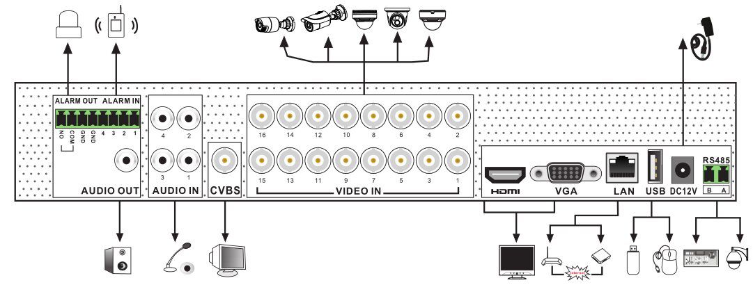 Este grabador   dispone de 4 entradas de Alarma (Alarm Input) y 1 salida relé. La alarma se dispara por niveles de tensión (Alto: 5V, Bajo: 0V). Puede instalar detectores externos como infrarrojos, detectores de gas, de humo… Una vez que el vídeo detecte un nivel alto de tensión, iniciará una grabación y/o disparará una salida de alarma.